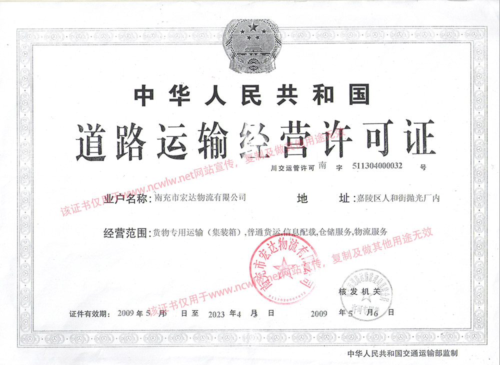 南充物流網(wǎng)(m.rzpcz.com) 南充市宏達(dá)物流有限公司道路運(yùn)輸經(jīng)營(yíng)許可證